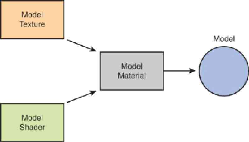 Trong các chương trình thiết kế 3D, tập hợp của Shader và Texture sẽ tạo ra Material. Tức Material là một loại vật liệu cụ thể, shader là khả năng biến toán thành trực quan của đồ họa máy tính, texture là chi tiết hình ảnh – cụ thể là những pattern, hình họa, đồ họa muốn thể hiện trên một bề mặt thông qua đồ họa máy tính.