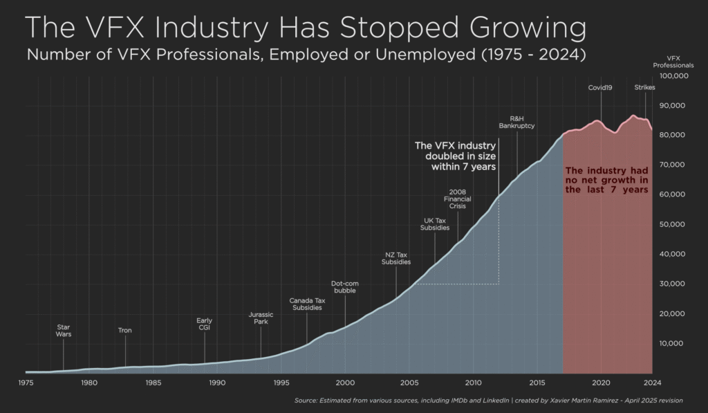 Biểu đồ tăng trưởng thực tế của lĩnh vực VFX & Animation từ một artist lâu năm đã mô hình hóa qua các nguồn dữ liệu thu nhập từ các cơ sở dữ liệu uy tín. Với mục tiêu cho thấy sự thay đổi của lĩnh vực này không hoàn toàn đến từ AI. Còn chưa nói là lĩnh vực này không hề có tăng trưởng.