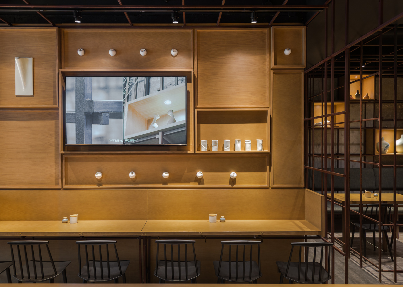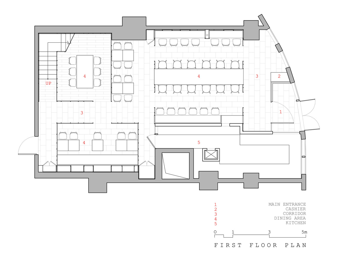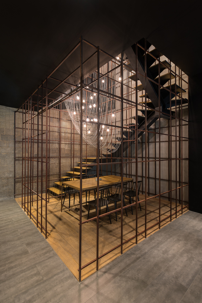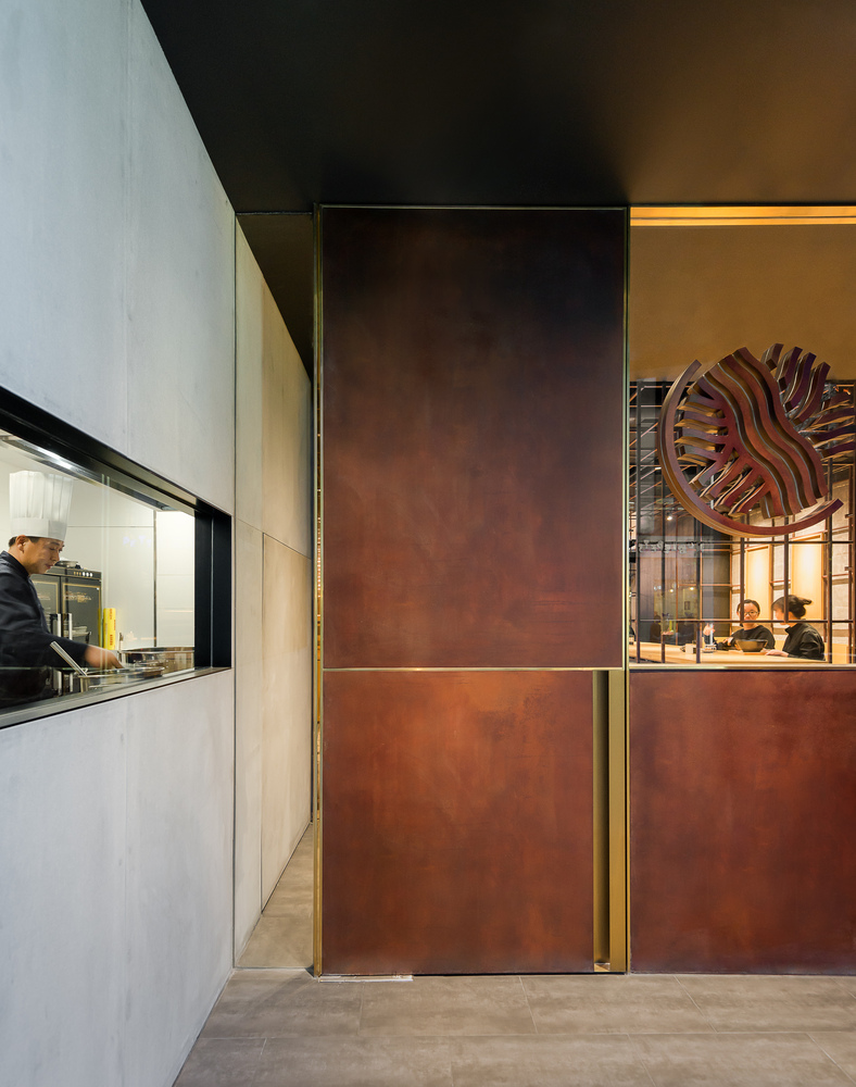 Từ sảnh đi vào, bạn sẽ bắt gặp gian bếp nằm phía bên tay trái và khu vực bàn ăn bên trong. Phía cuối cửa chính sẽ là các tấm thép và đồng với ba khối cho mỗi tấm. Ba khu vực ăn uống khác nhau đã được tạo ra từ các bức tường bê tông, bàn gỗ và những khối hộp. Khu vực đầu tiên mang phong cách căn tin với ba dãy bàn dài phục vụ cho dân văn phòng bận rộn. Khu vực thứ hai thiết kế theo phong cách Trung Quốc với bàn và ghế phù hợp cho những cuộc gặp mặt hay những người chậm rãi thưởng thức món ăn. Khu còn lại sẽ nằm cạnh góc cầu thang với những cọng “mì” treo phía trên.