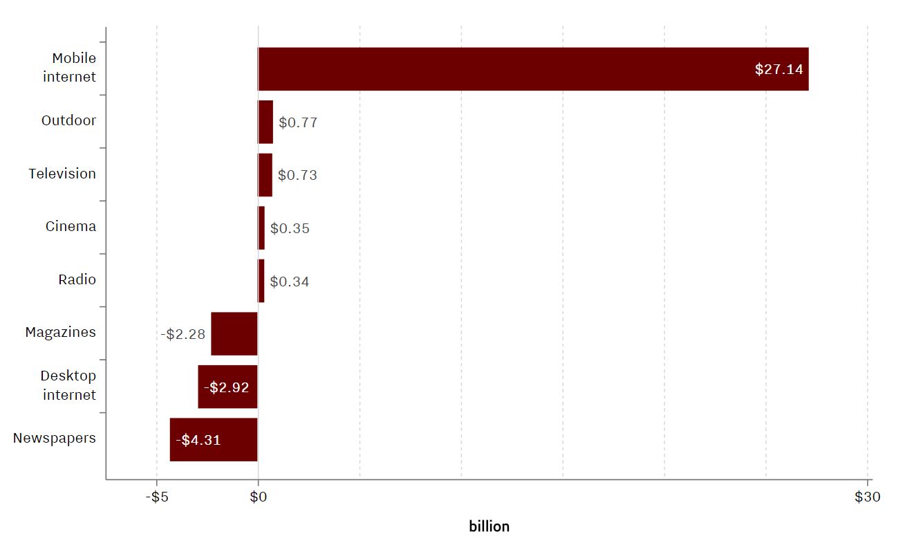 Trong khi đó thì dự kiến cho là quảng cáo trên các máy để bàn sẽ giảm $2.9 tỷ Đô La Mỹ, hoặc 3%, tới $96 tỷ Đô La Mỹ. Báo giấy gần như rơi thảm hại, giảm hơn $4.3 tỷ Đô La Mỹ vào 2017.