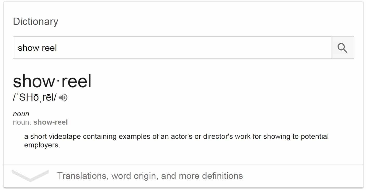 Và theo hình ảnh dưới đây Google trả lời thì đó gần như chính xác là một tập hợp các công việc bằng hình ảnh, âm thanh, nội dung được giàn dựng liền với nhau nhằm mục đích đưa cho nhà tuyển dụng coi sẽ thường là nhà sản xuất và công việc đó sẽ dành cho các nhà làm phim, biên tập phim, quay phim, diễn viên. Đó chính là ShowReel Với internet và công nghệ máy tính hiện nay, thì việc tập hợp các khối lượng công việc sẽ là qua file và biên tập trực tiếp trên máy tính.